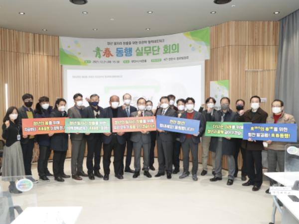 천안시는 지난 21일 오후 천안타운홀에서 12개 대학교와 천안시기업인협의회, 충남벤처협회, 충남북부상공회의소, ㈜천안소노벨리조트, ㈜신라정밀, ㈜SFA반도체, ㈜대일공업 등의 실무자들이 참석한 가운데 ‘청춘동행’ 실무단 회의를 개최했다고 밝혔다.
