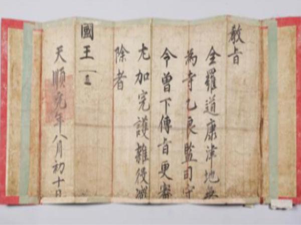 문화재청은 22일 ‘강진 무위사 감역교지(康津 無爲寺 減役敎旨)’라는 이름으로 국가지정문화재 보물로 지정고시 했다.