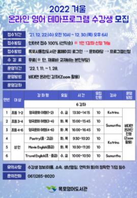 목포영어도서관이 내년 1월 11일부터 28일까지 3주간 초등학생과 성인을 대상으로 온라인 영어테마프로그램을 운영한다.
