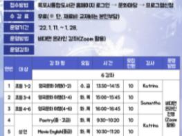 성인 대상으로는 해외여행 중 자주 쓰는 영어 표현을 배우는 ‘여행영어’, 작품을 감상하며 영미권 문학을 접하는 ‘영미시’, 영화를 통해 일상표현과 그 안에 담긴 문화를 배우는 ‘영화영어’ 등 3개 강좌를 운영한다.