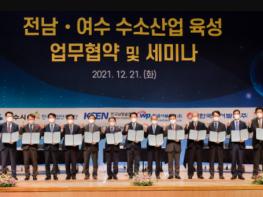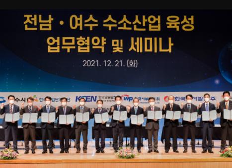 여수시가 민관 협력으로 미래 저탄소˙친환경 수소 에너지 시대의 초석을 마련하기 위해 지난 21일 ‘전남˙여수 수소산업 육성 업무협약’을 체결했다.