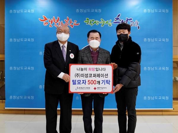 털모자 기탁식에는 김지철 충남교육감, 대한적십자사 충남지사 유창기 회장, ㈜미성코퍼레이션 박종성 사장과 기업 관계자 등이 참석한 가운데 진행되었으며, 기탁받은 털모자는 충남 도내 청소년에게 전달할 예정이다.