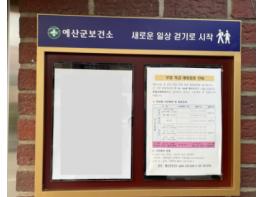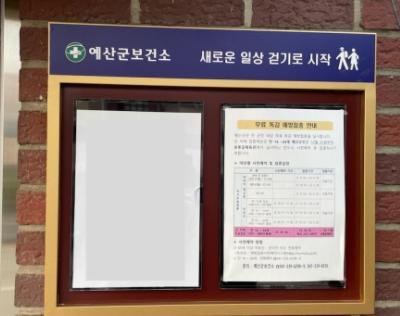 예산군보건소는 보건사업 안내 및 건강생활실천 환경 조성을 위해 관내 아파트 및 다세대 주택 11곳에 건강정보 게시판을 추가 설치·운영한다.