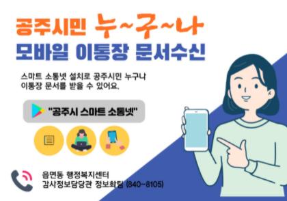 공주시는 스마트 소통넷을 통해 이통장이 수신하는 문서를 일반시민도 모바일로 수신할 수 있도록 한 서비스를 관내 모든 읍?면?동으로 확대한다고 23일 밝혔다.