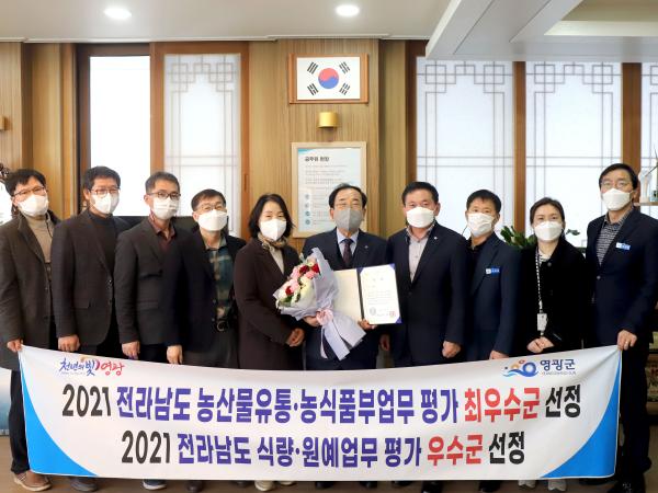 영광군은 농업의 고부가가치 창출로 농업인 소득증대를 위해 차별화된 시책추진 등을 인정받아 2021년 전라남도 농산물유통?농식품업무 평가 ‘최우수상’과 식량?원예업무 평가 ‘우수상’을 수상하였다고 밝혔다.