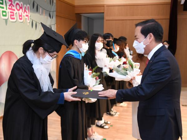 이번 졸업식은 관내 코로나19 재확산에 따라 사전 촬영한 녹화분을 편집하여 유튜브로 방송했으며 연간 활동보고, 졸업장 수여, 축사, 장학금 수여, 축하 공연 등의 순으로 진행했다.