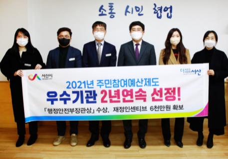 충남 서산시가 행정안전부 주관 ‘주민참여예산제 평가’에서 종합상 분야 우수 지자체로 2년 연속 선정돼 행안부장관상을 받는다. 특별교부세 6천만 원도 확보했다.