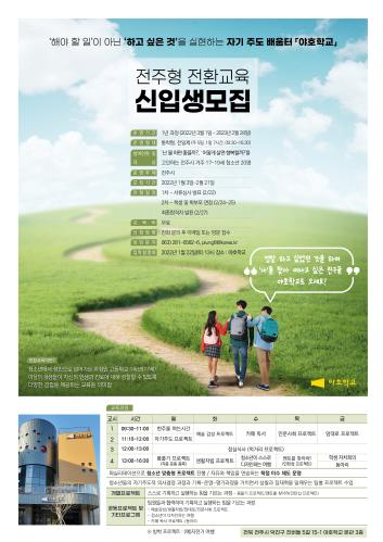 전주시 야호학교는 다음 달 3일부터 2월 21일까지 전주지역 17~19세 청소년을 대상으로 전주형 전환교육 신입생 20명을 모집한다.