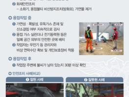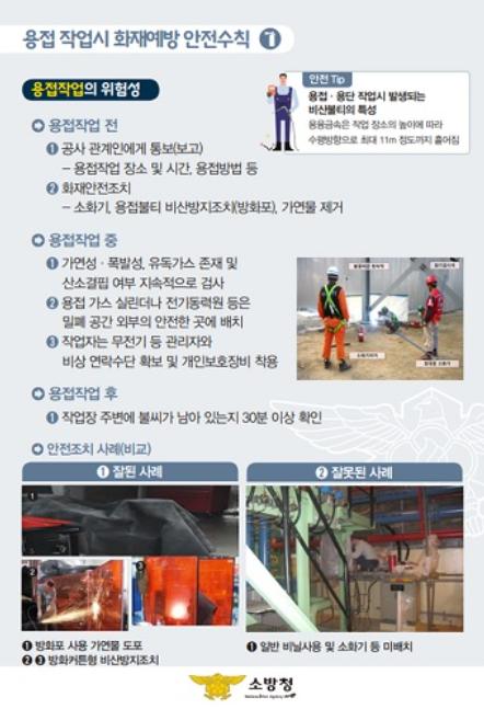 공사 현장 화재 예방을 위해서는 △용접·용단 작업 시 가연물 제거 △마른 모래, 소화기 등 비치 △인화성 물질은 화기 작업으로부터 10m 이상 격리조치(또는 방화 덮개 등으로 보호) △작업 후에는 작업장 잔여 불씨 확인 등의 안전수칙을 준수해야한다.