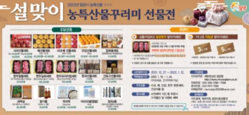 밀양시는 2022년 임인년(壬寅年) 설 명절을 앞두고 밀양에서 생산되는 농산물과 특산물을 온라인을 통해 합리적인 가격으로 구입할 수 있도록 풍성하게 준비했다.