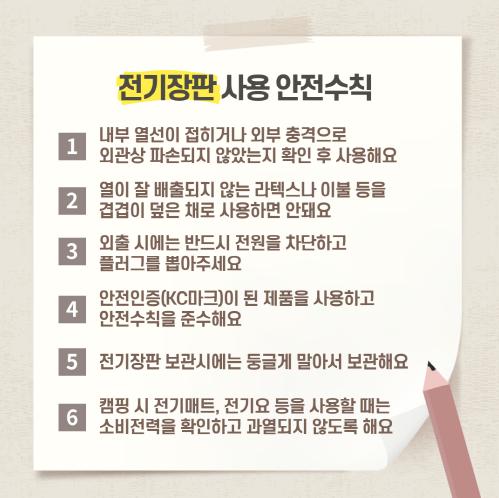 이에 천안서북소방서는 둥글게 말아 보관하기, 겹겹이 덮은채 사용하지 않기, 외출 시에 전원차단하기, KC마크 인증확인하기 등 전기장판 안전수칙을 지켜달라고 당부했다.