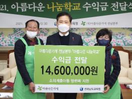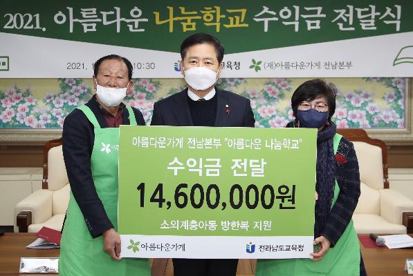 전라남도교육청과 (재)아름다운가게 전남본부이 12월 24일 전라남도교육청 비즈니스실에서 2021년 아름다운 나눔학교 수익금 전달식을 가졌다.