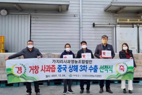 거창군은 24일 가지리사과영농조합법인에서 행복농촌과 김동석 과장을 비롯한 관계자 5명이 참석한 가운데 사과즙 중국 상해 수출 선적식을 가졌다.