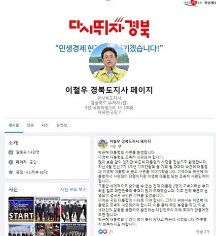 이날 이철우 경북도지사는 페이스북을 통해 박근혜 前 대통령 특별사면ㆍ복권에 대해 입장을 밝혔다.