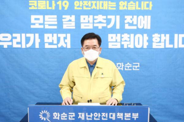 구충곤 화순군수가 군민에게 코로나19 확산세를 억제하기 위한 일상 방역수칙, 모임과 타지역 방문 자제, 백신 예방접종 동참을 강력하게 요청했다.