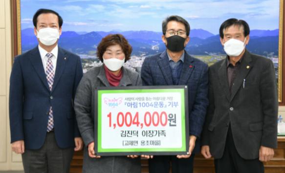 고제면 용초마을 김진덕 이장가족은 바르게살기경상남도협의회가 주최하고 경상남도가 주관한 제22회 아름다운 가정상 시상식에서 화목상을 수상하고 받은 수상금 전액을 아림1004 후원금으로 기탁했다. 김진덕 이장은 “수상의 기쁨을 뜻깊게 나누고 싶어, 가족들의 의견을 모아 아림1004운동에 동참하게 되었다”며 관내 어려운 이웃을 위해 소중히 써달라고 말했다.