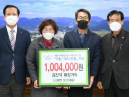 거창군은 24일 고제면 용초마을 김진덕 이장가족과 해광안전공사(대표 성태호)에서 아림1004운동 후원금으로 각각 1백만4천 원, ㈜장원목재(대표 장원석)에서 아림1004운동 후원금 5백만 원을 기탁했다고 밝혔다