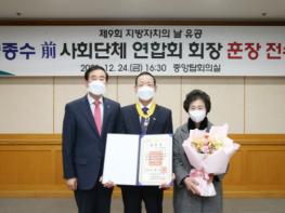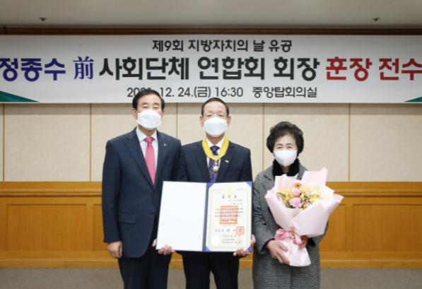 정종수 前 충주시사회단체연합회장은 ‘제9회 지방자치의 날’을 맞아 충주시사회단체연합회에 몸담았던 16여년 간 충주시에 위기가 닥쳤을 때마다 발 벗고 나서서 문제를 해결하며 주민이 주도하는 참된 지방자치를 실현했다는 공로를 인정받았다.