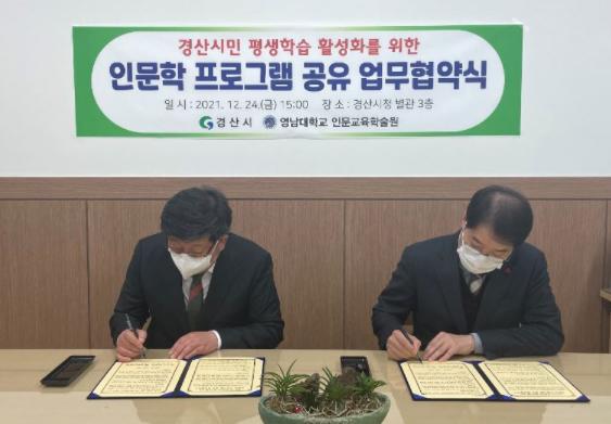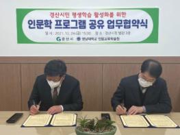 경산시는 24일 경산시청 별관에서 복지문화국장을 비롯한 영남대 인문교육학술원 관계자 등 8명이 참석한 가운데 「경산시민 평생학습 활성화를 위한 인문학 프로그램 공유 업무협약」을 체결하였다고 밝혔다.