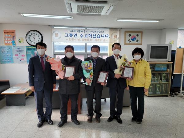 퇴임하는 환경미화원 3명(김종수, 강병욱, 지영철)은 “퇴임을 맞아 감회가 새롭고 재직하는 동안 어려운 일이 있을 때마다 도움주신 동료 분들 덕분에 무사히 정년퇴임을 맞이하게 되었다.”며 감사인사를 전했다.