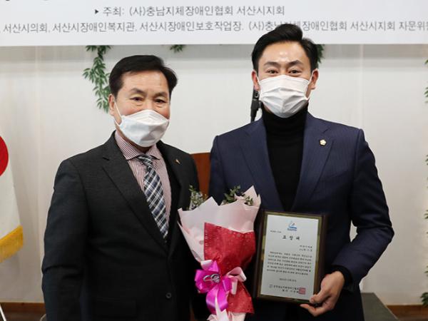 서산시의회 최기정 의원(부춘·석남·인지)이 23일 파티 루체 미다옴에서 열린 ‘제19회 서산시 지체장애인 자활증진대회’에서 (사)충청남도지체장애인협회 이건휘 회장으로부터 표창패를 받았다.