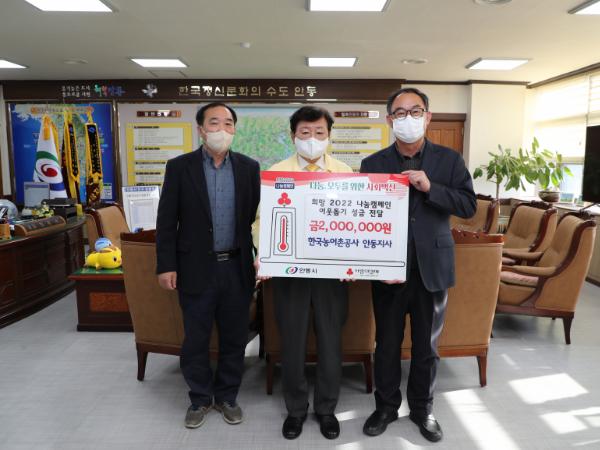 한국농어촌공사 안동지사는 어려움을 겪고 있는 이웃을 위해 12월 24일 안동시를 방문하여 성금 2백만원을 기탁하였다.