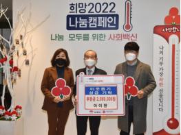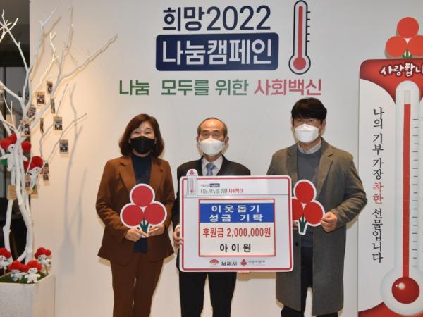 12월 24일 아이원에서 관내 생활형편이 어려운 저소득 가정에게 지원하기 위해 이웃돕기성금 200만원을 기부함으로써 어려운 이웃에게 사랑을 전하는 '희망2022 나눔캠페인'에 동참하였다.
