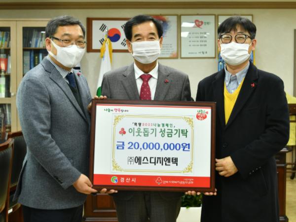 ㈜에스디지엔텍에서 23일 경산시청을 방문하여 추운 겨울 난방에 어려움을 겪는 이웃을 위하여 성금 2,000만 원을 기탁했다.