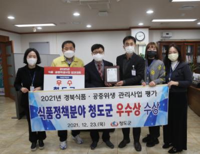청도군은 지난 23일 경주 The-k 호텔에서 경상북도 주관으로 개최된 2021년 시?군 식품공중위생 담당공무원 성과대회에서 2021년도 경북 식품정책 및 경북안심식당 운영평가 2개분야에서 우수상을 수상하는 영예를 안았다.