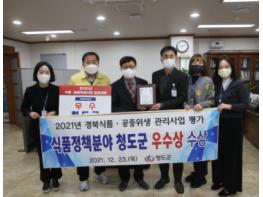 식품정책평가 부분에서는 코로나19 대응속에서도 생활방역과 함께 음식문화 개선을 위해 덜어먹기 식문화 정착을 위해 전광판 홍보 등을 실시, 맛집 발굴, 추어탕거리 운영 등으로 많은 사람들이 청도군을 찾도록 SNS와 청도맛나들이 홈페이지를 통해 안내한것과, 또한 코로나19로 경제적으로 어려운 음식점에 방역수칙 준수에 도움을 주고자 안심콜, 출입자 명부, 소독대장, 방역수칙 포스터, 손소독제등 다양한 방법으로 지원한 것이 높이 평가받았다.