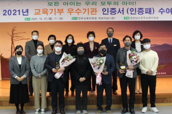 경상남도진주교육지원청은 27일 대회의실에서 ‘2021년 교육기부 우수기관 인증서 및 인증패 시상식’을 가졌다.