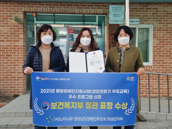 ㈔느티나무경상남도장애인부모회 창녕군지부는 2021년 발달장애인지원사업 중 발달장애인 부모교육지원사업 ‘우리는 LTE(Let’s Try Everything)!’로 보건복지부장관 표창을 수상했다고 27일 밝혔다.