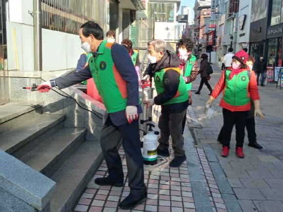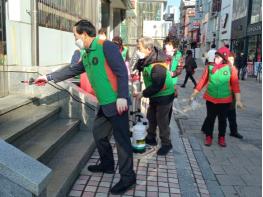 청주시 지역자율방재단음 연말연시를 맞아 코로나19 확산을 방지하고자 지역 내 번화가를 대상으로 방역 작업을 실시하고 있다.