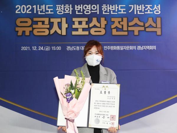이날 수상은 2021년 한 해를 마무리하며 평화와 번영의 한반도 기반조성에 기여한 공로가 큰 자문위원들에게 의장인 대통령을 대신하여 최충경 민주평통 경남부의장이 의장(대통령)표창을 전수하였으며, 하병필 경남도지사 권한대행이 도지사 표창을 수여하였다.
