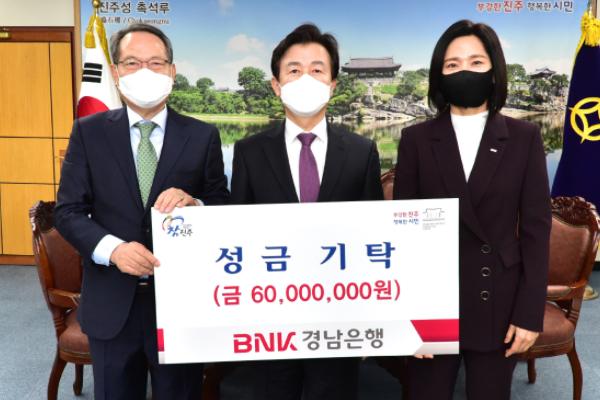 ㈜경남은행은 27일 시청 기업인의 방에서 어려운 이웃을 위한 복지사업에 사용해 달라며 성금 6000만 원을 진주시복지재단에 기탁했다.