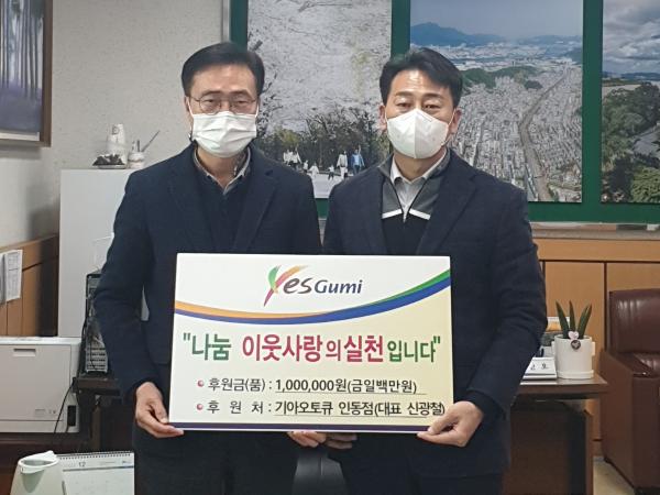 진미동에서는 2021. 12. 24 11:00 기아오토큐 인동점 신광철 대표가 진미동행정복지센터를 방문하여 어려운 이웃을 위한 희망2022 나눔캠페인 성금 100만원을 기부하였다.