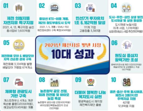 제천시는 금년 한 해를 마무리 하면서 민선7기 시정 목표인 다시 뛰는 도심, 희망의 경제도시 조성을 목표로 야심차게 추진한 2021년 시정 주요 10대 성과를 발표했다.