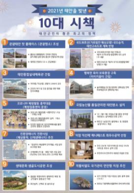 군은 10대 시책 외에도 올해 △어촌뉴딜300 사업 추진 △동학농민혁명기념관 건립 △태안군UV랜드 조성 △영목항 국가어항 개발 △두야-정죽(국지도96호) 4차로 확포장공사 확정 등 각 분야에서 많은 성과가 있었다며, 내년에도 지역 발전을 이끌어갈 다양한 사업 발굴 및 추진에 힘쓰겠다는 각오를 밝혔다.