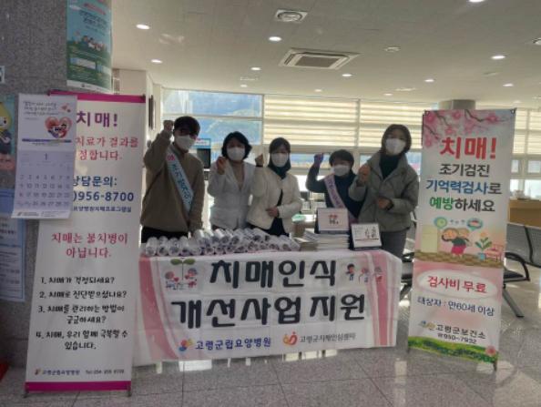 이날 캠페인은 고령군립요양병원이 치매관리 기능을 수행하는 지역사회 주요 의료기관으로써, 치매인식 개선과 치매극복 공감대 형성을 위해 보건소와 함께 노력하고 있음을 알리기 위해 실시하였으며, 치매인식개선 달력 등도 함께 배부하였다.