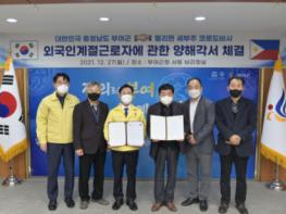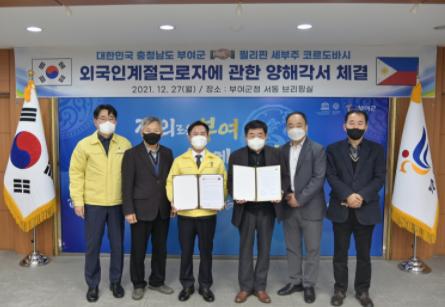 부여군은 농촌 인력난 해결을 위해 지난 27일 군청 브리핑실에서 필리핀 세부 코르도바시와 외국인 계절근로자 양해각서를 체결했다.