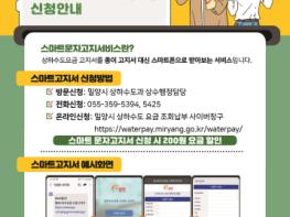 스마트 문자고지를 희망하는 수용가에서는 밀양시 상?하수도요금 조회 납부 사이버창구 또는 전화로 신청이 가능하다.