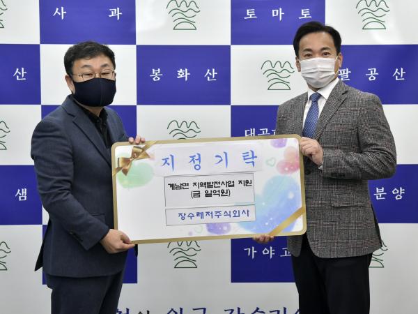 장수레저주식회사가 28일 장수군청을 방문해 계남면 지역발전 사업지원을 위한 지정기탁금 1억 원을 전달했다.