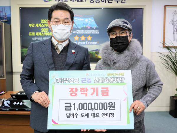 달바우도예 대표는 부안군 근농인재육성재단을 방문하여 장학금 100만원을 기탁했다. 금번 장학금은 안미정 대표의 석사학위 논문 출품작 판매 수익금을 기부한 것으로 그 의미가 남다르다.