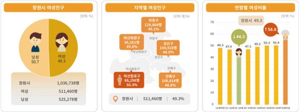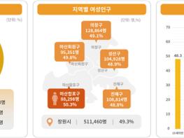 보고서에 따르면, 2020년 12월말 창원시 여성인구는 511,460명으로 전체 인구의 49.3%를 차지하고 있으며, 여성인구 비율이 가장 높은 지역은 마산합포구(50.3%)로 나타났다.
