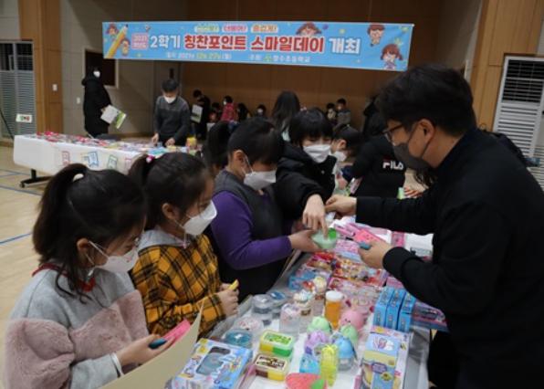 올해로 두 번째 개최하는 ‘칭찬포인트 스마일데이’는 코로나19로 인해 '학부모의 창수 먹자골목'이 폐지되는 아쉬움이 있었지만, 학교생활 및 일상생활에서 노력하는 삶의 행복을 느끼게 하고, 포인트 활용의 즐거움을 느끼기에는 충분하였다. 작은 학교 자유학구제로 영해에서 등교하는 2학년 서○○ 학생 학부모는 다른 학교에서는 경험할 수 없는 인성교육 프로그램으로 학생들도 좋아하지만 학부모들도 만족도가 높은 행사라고 말하며, 선생님들이 학생을 위해 헌신적으로 노력해 주심에 감사를 드린다고 하였다.