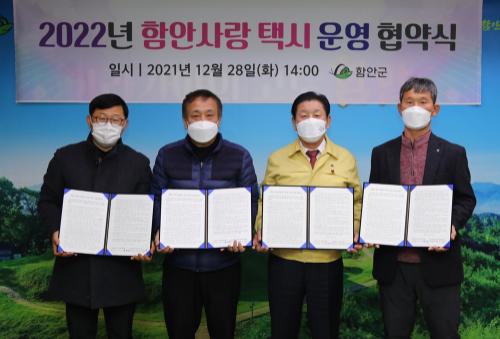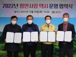 함안군은 28일 군수실에서 조근제 군수와 3개 협약택시업체 대표자, 관계 공무원이 참석한 가운데 ‘2022년 함안사랑택시 운영 협약’을 체결했다고 밝혔다.