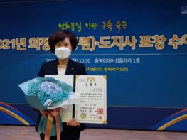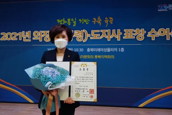 충북도의회 정책복지위원회 이숙애(청주1) 의원이 28일 충북미래여성플라자에서 열린 민주평화통일자문회의 충북지역회의 유공자문위원 표창 수여식에서 의장 표창을 받았다.