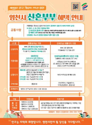 영천시는 2022. 1. 1.자로 ‘영천시 인구늘리기 시책 지원 조례’를 일부 개정하여 조례 개정일 이후 혼인신고하는 신혼부부에게 결혼장려금 300만원을 지원한다고 밝혔다.
