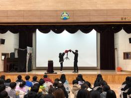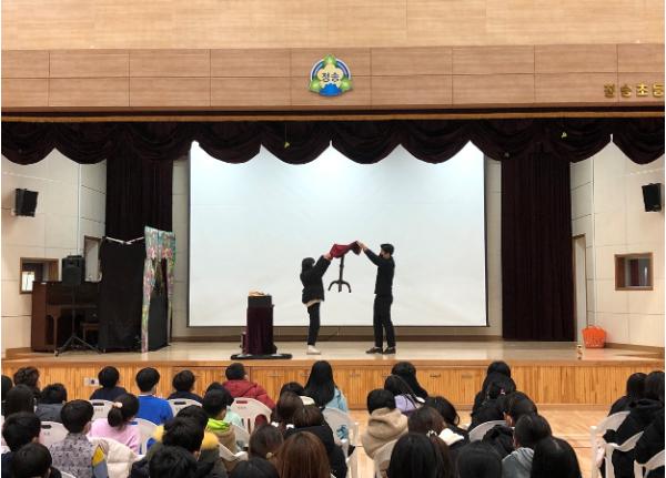 세 번째 예술교육 공연은 인형극 및 마술쇼 공연이다. 학년성에 맞추어 유치원과 1~2학년을 대상으로는 인형극, 3~6학년을 대상으로 는 마술쇼와 그림자 극을 기획하였다. 힘들어도 끝까지 포기하지 않는다는 주제를 담은 인형극을 관람하며 학생들은 스스로 자신의 마음과 태도를 생각하고 더 발전하도록 노력하는 계기를 만들었다. 또한 학생들이 흥미를 가질 다양한 마술 도구들로 공연을 펼친 마술쇼를 보면서 자신만의 상상과 추리를 해보며 즐겁게 공연에 참여하는 모습을 보였다. 마술쇼 중에 마술사와 학생들이 함께 소통할 수 있는 다양한 레크레이션 활동을 넣어 학생들이 직접 마술에 참여를 해보는 시간을 가지기도 했다. 이러한 두 공연을 통해 학생들은 창의적 사고 역량, 심미적 감성 등 다양한 가치를 길렀다.