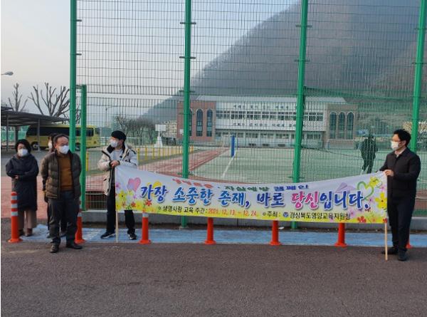 영양교육지원청는 코로나-19 장기화에 따른 학생 정신건강 위기 심화의 적극적 개선과 생명존중 문화 조성을 위해 12월 22일 영양중·고등학교 학생 및 교직원 대상으로 등굣길 ‘생명사랑 교육활동 캠페인’을 실시하였다.